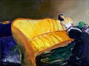 "A lone woman lays back on a golden couch staring deeply into the void before her, with what appears to be a book in hand etched in oil across the canvas.